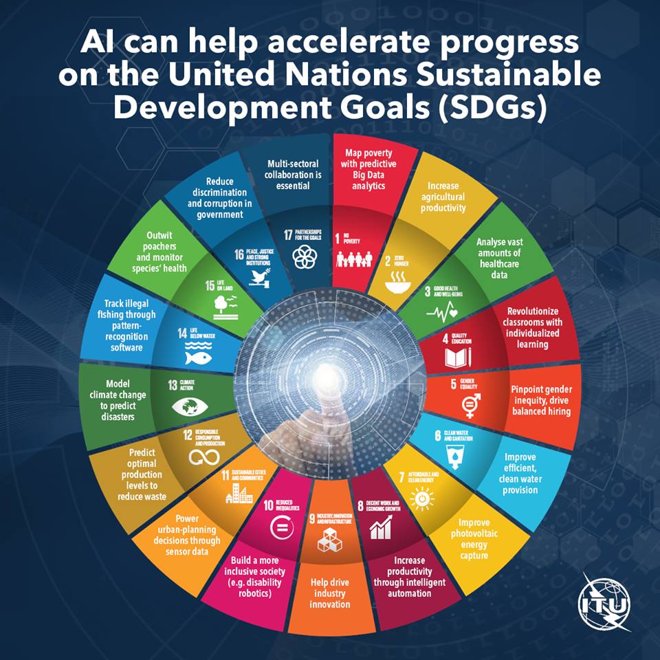 Международный союз электросвязи (МСЭ) или ITU подготовил диаграмму, показывающую, как искусственный интеллект (artificial intelligence) поможет достигнуть целей 17 целей устойчивого развития ООН (Sustainable development goals – United Nations):