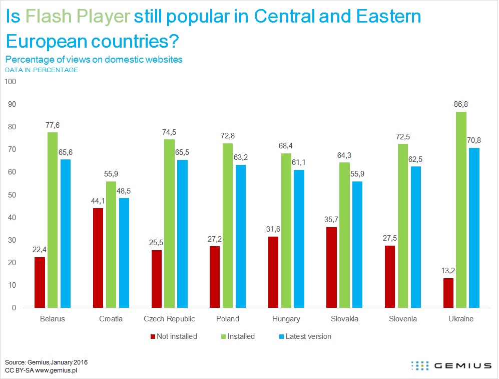 Данные за январь 2016 года (источник: исследование gemiusPrism) показывают, что интернет-пользователи в европейских странах по-прежнему заинтересованы в использовании Flash Player. Более того, они обновляют программное обеспечение. Достаточно высокая доля просмотров страниц на местных сайтах совершается с использованием последней версии Flash Player.