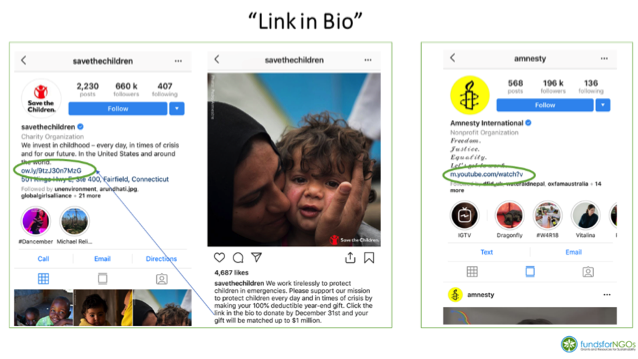 Instagram ограничивает использование внешних URL-адресов через приложение, кроме одной ссылки, которую вы можете добавить в свой профиль Instagram в разделе веб-сайта. Вместо того, чтобы сохранять постоянную ссылку в качестве домашней страницы вашего сайта, многие учетные записи используют эту функцию для предоставления важной ссылки своим пользователям. Например, @savethechildren проводит кампанию по сбору средств на конец года, и их профильной ссылкой является страница «Пожертвовать сейчас» на своем веб-сайте. Каждый пост, посвященный сбору средств, призывает пользователя щелкнуть «ссылку в био». С другой стороны, профиль @ amnestyinternational содержит ссылку на их последний видео-релиз, направляющий трафик на их канал YouTube. В идеале ссылка должна направлять пользователя к вашему последнему начинанию, будь то событие, публикация или даже продвижение.