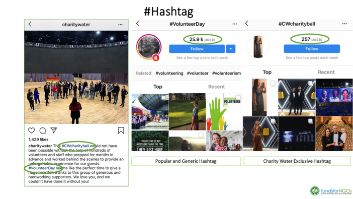 Хештеги могут служить обеим целям: (1.) Добавить релевантные, но популярные хештеги, чтобы гарантировать, что ваш пост появляется, когда люди ищут эти ключевые слова, и (2.) Создать уникальный личный хештег, который относится исключительно к вам и вашей аудитории. использовать, когда делится о вас. На рисунке показано, что @charitywater использует #VolunteerDay, популярный хэштег с ~ 26K постами, а также #CWCharityBall, который является эксклюзивным хэштегом для их мероприятия.