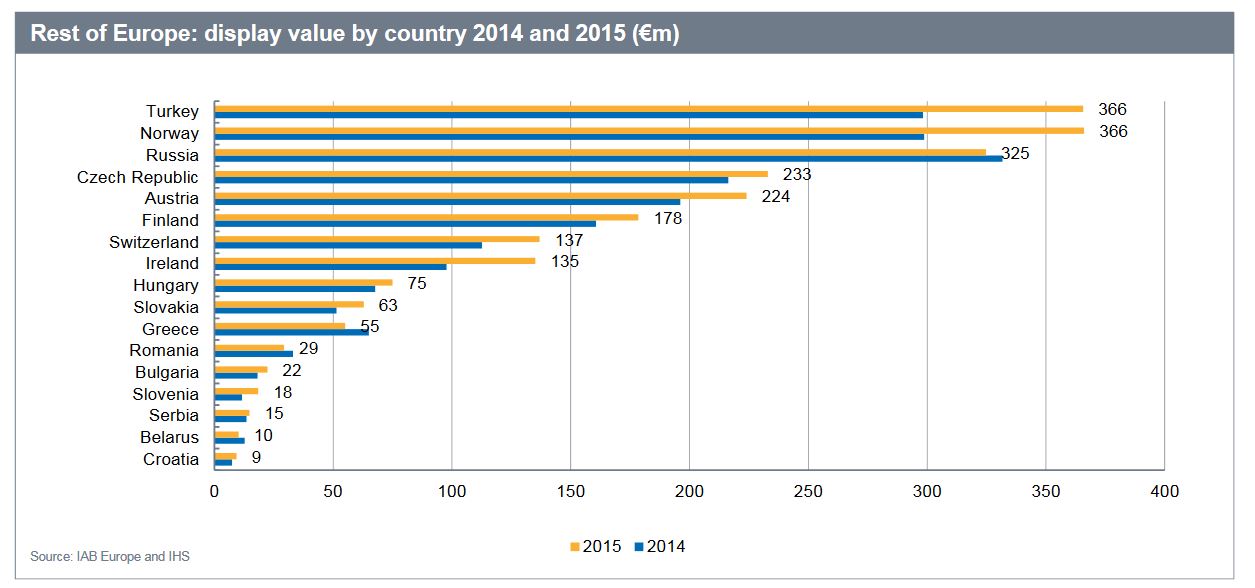 Ирландия также лидирует по приросту рекламного рынка — в 2015 году он составил 29%. Высокие темпы показывают Болгария (+22,3%) и Польша (+21,8%). По объему рынка интернет-рекламы (1,5 млрд евро) Россия занимает шестую строчку, ее опережают Великобритания (11,8 млрд евро), Германия (5,8 млрд евро), Франция (4,2 млрд евро), Италия (2,1 млрд евро) и Нидерланды (1,6 млрд евро).