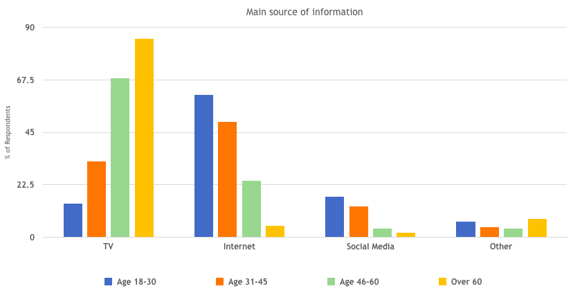 Как видно из графика, предпочтительные источники информации, по-видимому, играют важную роль, но точная причинно-следственная связь остается неясной. Молодые люди избегают телевидения, потому что оно обеспечивает постоянный рацион контролируемой государством информации, и вместо этого обращаются к Интернету и социальным сетям? Или доступ к информации в Интернете о природе западных обществ ведет к отказу от того общества, которое Лукашенко контролировал десятилетиями? В любом случае, чрезмерная зависимость от телевидения информации для лиц старше 60 лет резко контрастирует с той ролью, которую Интернет играет примерно для половины респондентов моложе 45 лет.
