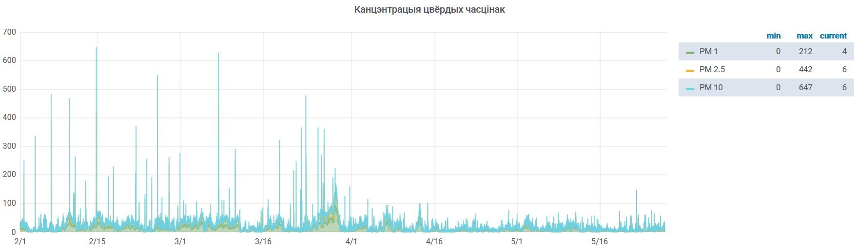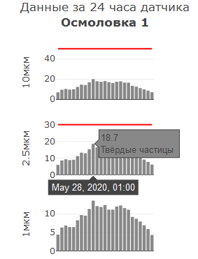 Он показал графики, выстроенные по результатам наблюдений за последние 3 месяца в Осмоловке: мобильный датчик был установлен на доме по улице Киселева. Замеры велись по трем группам частиц: РМ10 (размером менее 10 микрон), РМ2,5 (размером менее 2,5 микрона) и РМ1 (размером менее 1 микрона). К частицам РМ2,5 относятся смесь частиц пыли, золы и сажи, а также сульфатов и нитритов, находящихся во взвешенном состоянии в воздухе. Норма их концентрации согласно ВОЗ — 25 микрограммов на кубический метр.