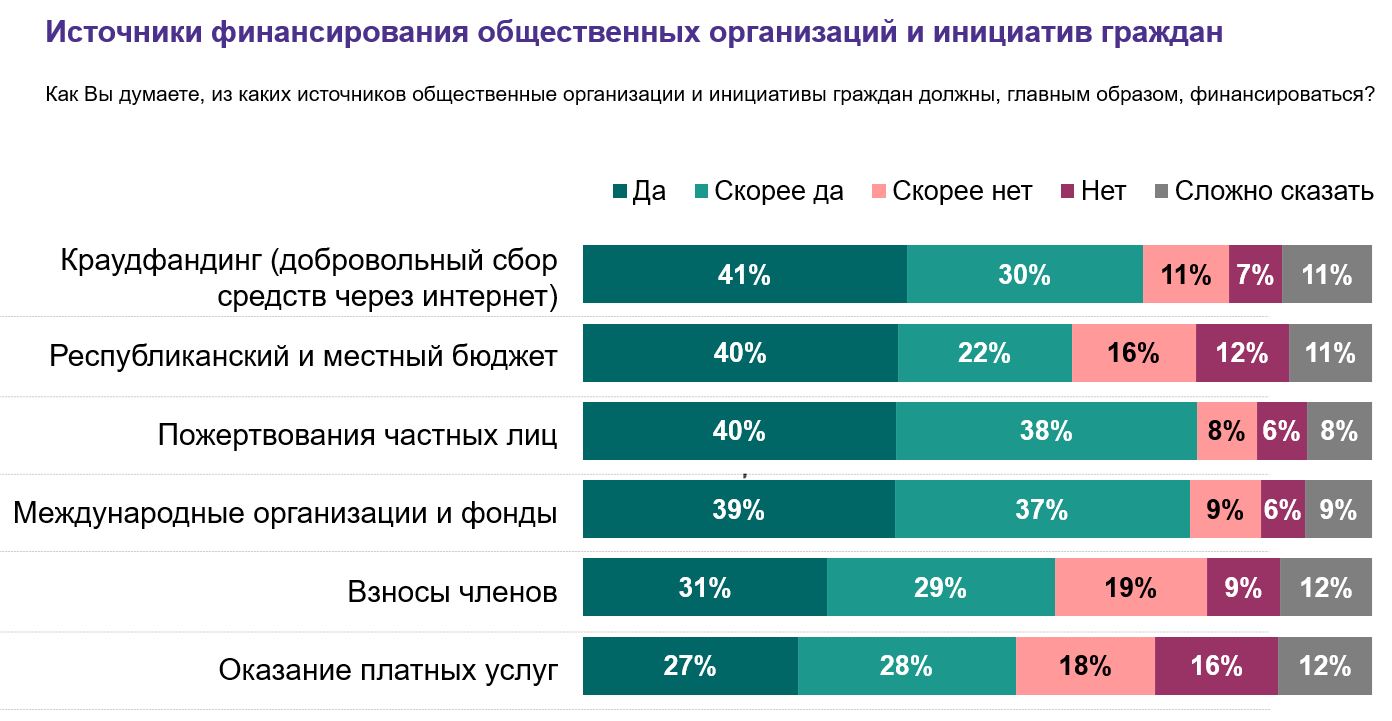 Как видно, что на первой позиции по ответу “да” находится – краудфандинг (crowdfunding). Конечно, если объединить ответы “да”, “скорее да”, то сначала будут “пожертвования частных лиц” (78%), “международные организации и фонды” (76%). Краундфандинг на третьей позиции с 71%.