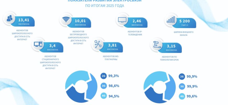 Активно развивалась сеть сотовой подвижной электросвязи стандарта LTE и услуги на ее основе. За январь-декабрь 2025 года охват территории и населения услугами сотовой подвижной электросвязи стандарта LTE составил 94,5% и 99,6% соответственно.