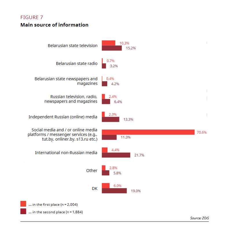 Более 70 процентов респондентов сообщили, что они получали большую часть информации из социальных сетей и онлайн-платформ. Лишь около 10% заявили, что обращаются к государственным СМИ как к основному источнику информации.