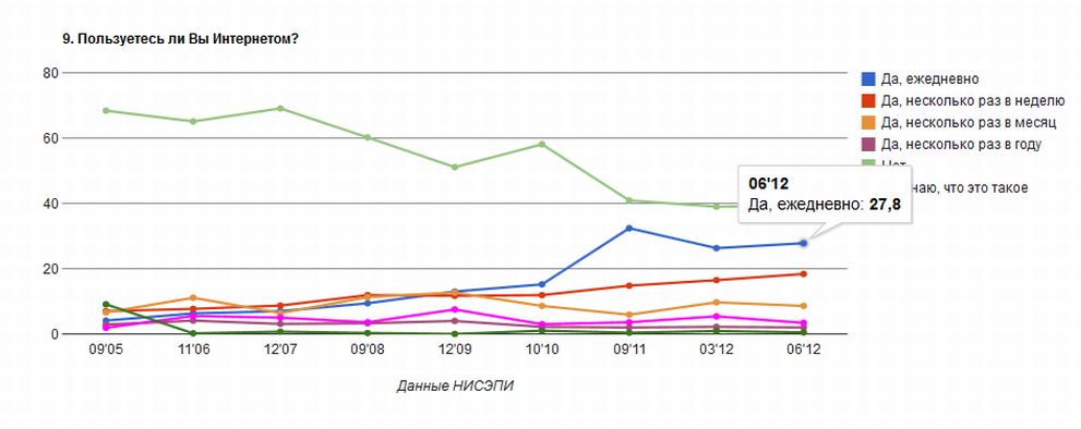 По случаю обновления сайта НИСЭПИ, зарегистрированного в Литовской Республике, интересно посмотреть на динамику изменения уровня проникновения интернета в Беларуси на основании проведения много лет опросов методом face-to-face.