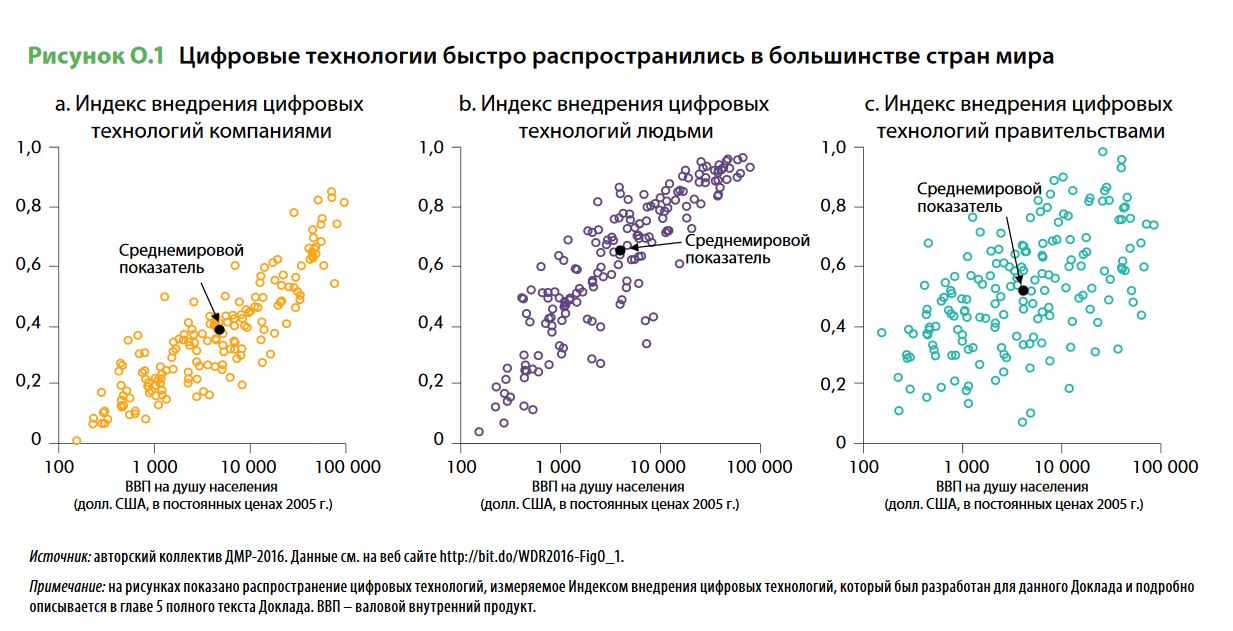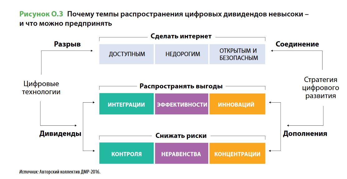 Цифровые технологии быстро распространились в большинстве стран мира. А вот цифровые дивиденды – более широкие выгоды для развития от использования этих технологий – запаздывают. Во многих случаях цифровые технологии стимулировали экономический рост, создавали возможности и повышали эффективность оказания услуг. Однако совокупный эффект от их использования оказался слабее ожидаемого и распределяется неравномерно. Для того, чтобы от использования цифровых технологий в выигрыше оказались все и повсюду, необходимо преодолеть сохраняющийся «цифровой разрыв», особенно в области доступа к интернету. Однако более масштабное внедрение цифровых технологий – это ещё не всё. Чтобы максимально использовать потенциал цифровой революции, странам необходимо заниматься и «аналоговыми дополнениями»: совершенствовать законодательство, обеспечивающее конкуренцию между компаниями,