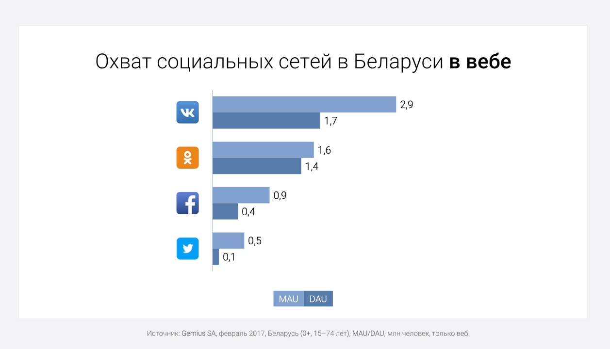 К примеру, из свежих цифр – в июньском отчете общий охват (Reach) социальными медиа составил 3,940 миллиона человек или почти 80% от всей беларусскай интернет-аудитории.