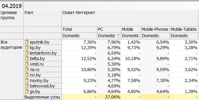 Общая компьютерная интернет-аудитория 76 новостных сайтов, включая новостные разделы news.tut.by, news.mail.ru, news.yandex.by, составила 51% охвата (Reach), с учетом пересечения (duplication) всей беларускай компьютерной интернет-аудитории или 2,171 миллиона человек в возрасте 15-74 года.