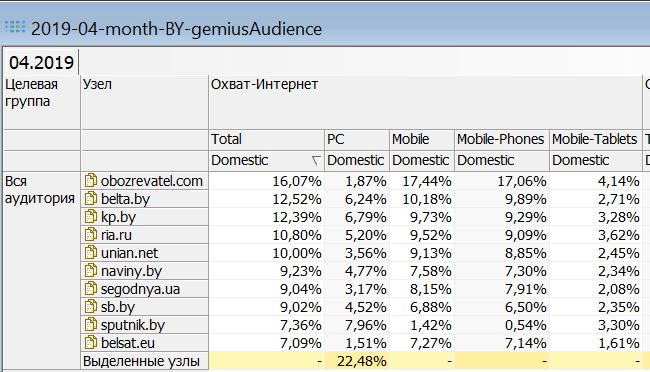 Конечно, безусловным лидером является news.tut.by c 28% охвата компьютерной интернет-аудитории и 52% всей беларусской интернет-аудитории. В частности, более 54% мобильной (телефоны и планшеты) интернет-аудитории Беларуси.