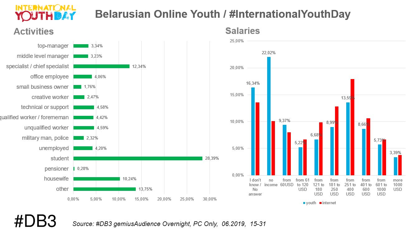 Исследовательская компания #DB3 подготовила на основании данных регулярного медиаисследования подготовила небольшую инфографику про беларускую онлайн интернет-молодежь. Молодых людей в возрасте 15-31 года, которые использовали PC в июне 2019 года было 1,5 миллиона человек.