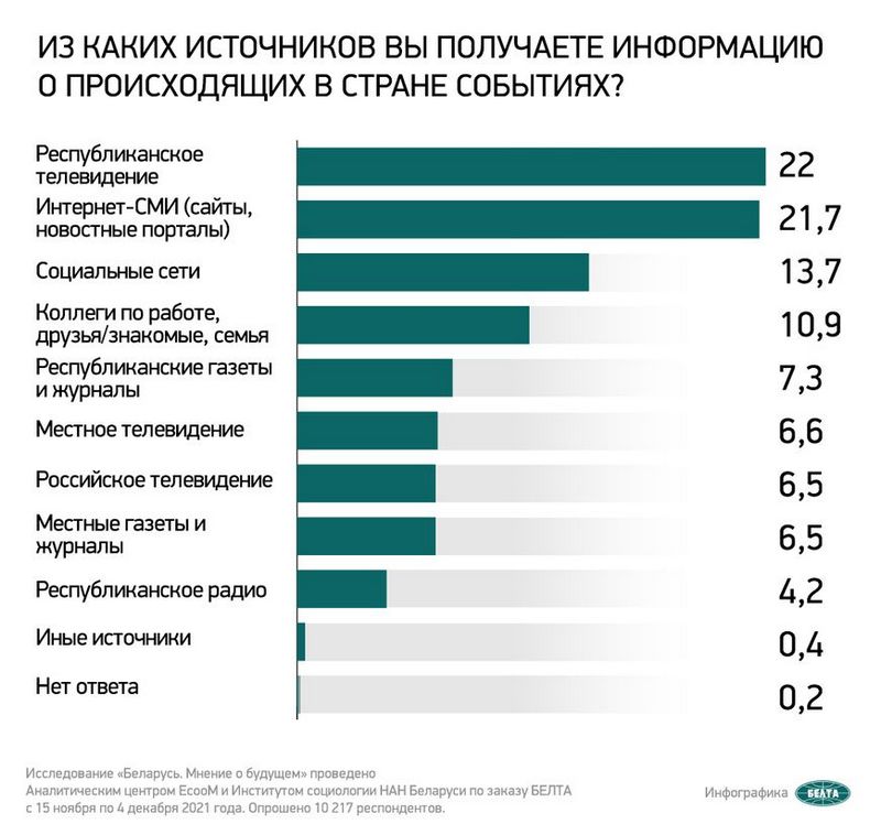 Основным источником получения информации о происходящих в стране событиях белорусы назвали республиканское телевидение и интернет-СМИ. Об этом свидетельствуют данные социологического исследования «Беларусь. Мнение о будущем».