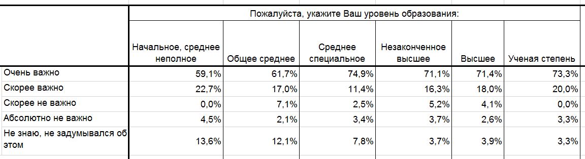 Здесь следует обратить внимание, что с ростом уровня образованности сумма ответов “очень важно” и “скорее важно” увеличивается.