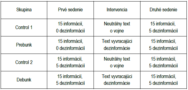 Целью нашего исследования было измерить доверие к избранной дезинформации о войне России против Украины и сравнить эффективность классического и превентивного опровержения. Таким образом, было исследовано, работает ли опровержение до или после того, как люди подвергаются дезинформации. В то же время дезинформация была помещена между истинной и ложной информацией, и мы могли, таким образом, сравнивать среднюю степень убежденности в отдельных группах утверждений. Разница между дезинформацией и ложной информацией заключалась в том, что, в отличие от ложной информации, дезинформация создается и распространяется с намерением причинить кому-то вред. Кроме того, мы рассмотрели, присутствовал ли в данном случае побочный эффект, т. е. повлияло ли опровержение дезинформации также на веру в истинные и ложные утверждения о войне. Все это было осуществлено посредством лабораторного эксперимента в Экономическом университете в Братиславе, в котором приняли участие 242 студента третьего и четвертого курсов. Этот эксперимент проходил в два этапа в летнем и зимнем семестрах 2022/2023 учебного года. Студенты были разделены на группу с классическим опровержением, группу с превентивным опровержением и соответствующие контрольные группы без какого-либо вмешательства. Такое разделение было необходимо для сравнения эффекта отдельных вмешательств. в группу с профилактической регургитацией и соответствующие им контрольные группы без какого-либо вмешательства. Такое разделение было необходимо для сравнения эффекта отдельных вмешательств. в группу с профилактической регургитацией и соответствующие им контрольные группы без какого-либо вмешательства. Такое разделение было необходимо для сравнения эффекта отдельных вмешательств.