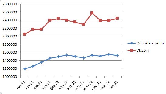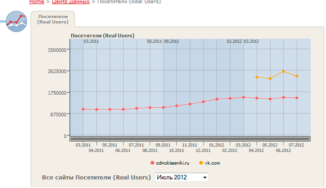 Исследовательская компания Gemius представляет данные по странам Восточной Европы. Мы решили обратиться к данным по Украине и Белоруссии. В Белоруссии по количеству посетителей ВКонтакте превосходит Одноклассники. Однако за нехваткой данных по первой сети тенденцию вывести сложно.