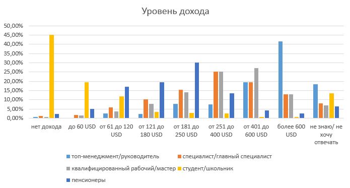 Наверное, не стоит делать вывод, что с ростом доходов этот процент возрастает. Однако доля выбравших этот ответ в августе была выше, чем доля тех, кто дал ответ о доходе более 600 USD в месяц — 10,61%.