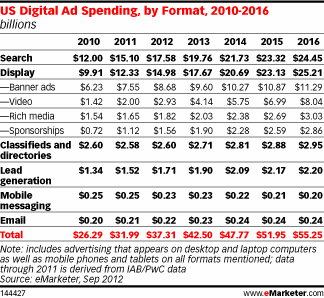 Все обратили внимание на первую таблицу из статьи Google to Become US Display Ad Leader, что доходы Google от медийной (display) рекламы будут расти, но самая интересная табличка в этом материале – это структура расходов на интернет-рекламу в США: