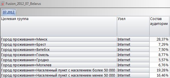 За последние месяцы самая важная инновация, на мой взгляд, в гибридном исследовании белорусской интернет-аудитории gemiusAudience, использующего fusion-технология, – это показ интернет-пользователей из больших промышленных городов (более 50000 жителей) и малых городов и сельской местности (менее 50 000 жителей):