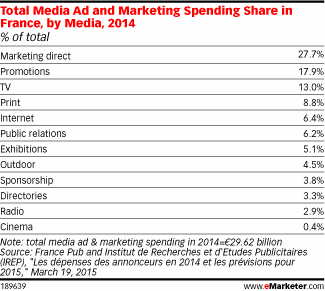 Общие рекламные расходы во Франциии составили €13 миллиардов, что на 2,5% меньше, чем в 2013 по данным “Les Dépenses des Annonceurs en 2014 et les Prévisions pour 2015″, опубликованным France Pub и Institut de Recherches et d’Etudes Publicitaires (IREP).