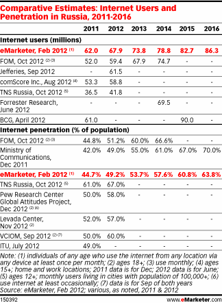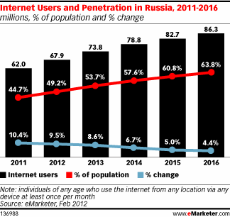 За последние несколько лет в стране на достойном уровне расширили свою работу мобильные 3G-сети, что, в результате, привело к повышению качества обслуживания и снижению цен, и помогло повысить степень пользования мобильным интернетом. По оценкам eMarketer, в 2013 году в России будет насчитываться 43,9 миллиона пользователей мобильного интернета. К 2016 году это число увеличится почти вдвое – до 74,3 миллиона человек.