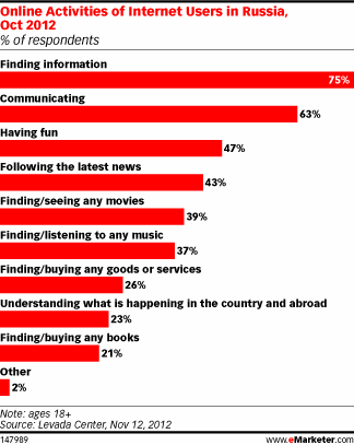 Российские интернет-пользователи чаще читают новости и общаются друг с другом, чем занимаются бизнесом. Хотя некоторые и заходят в интернет для покупки товаров и оплаты услуг (26%), их все еще меньшинство. Об этом свидетельствуют данные исследования, проведенного в октябре 2012 года «Левада-центром».