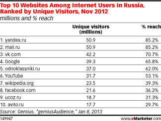 В экосистеме российского интернета господствует русский язык – настолько, что российский сегмент даже называют Рунетом. В более широком смысле, самые популярные сайты в стране по большей части созданы отечественными производителями: у Yandex наибольшая доля рынка среди компаний, занимающихся поисковыми системами; Mail.ru остается лидирующим почтовым сервисом, а «ВКонтакте» – самой популярной социальной сетью. Правда, Facebook и Google также попали в десятку популярных сайтов, согласно данным Gemius от ноября 2012 года.