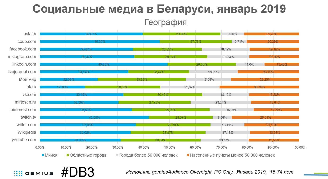 Самая большая доля минской аудитории в композиции – Linkedin.com, в областных городах – Мой мир, в крупных промышленных городах – Одноклассники, как и в населенных пунктах с населением менее 50 000 человек.