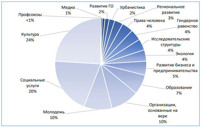 По данным исследования «Гражданское общество Беларуси: актуальное состояние и условия развития», больше всего организаций и инициатив функционирует в сфере социальных услуг (20%) и культуры (24%), меньше всего — в сферах информирования и медиа (1%), регионального развития (3%), гендерного равенства (4%) и прав человека (4%) . Иными словами, преобладают организации, деятельность которых связана с социальным благополучием. Организаций же, связанных с проблематикой «новых социальных движений», меньше всего.