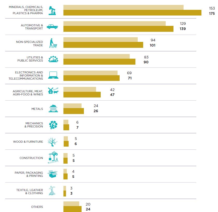 Пока лидируют по количеству компании работающие с традиционным сырьем -95 (нефть, газ, минеральные удобрения и так далее), но автомобилестроение и транспорт подобрались вплотную – 93. Отрасль “Электроника, информация и телекоммуникация” четвертая по числу компаний – 65.