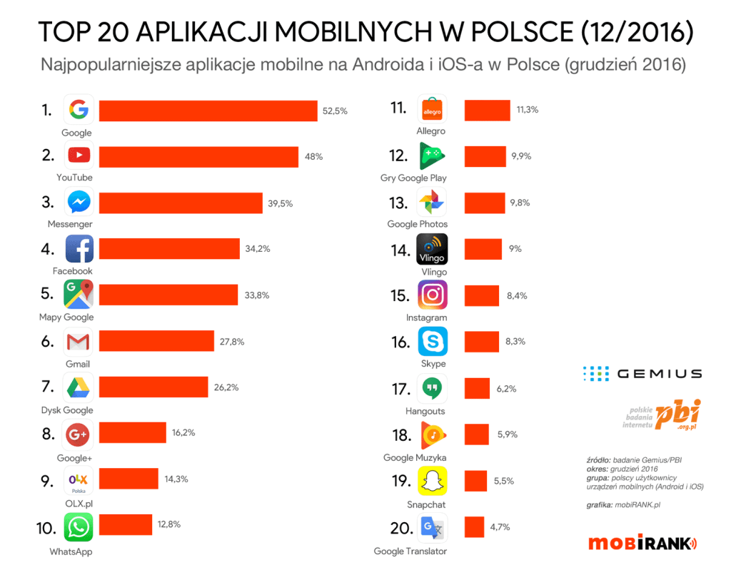 Исследование PBI/Gemius опубликовали топ20 популярных мобильных приложений в декабре 2016 в Польше на платформах iOS и Android.
