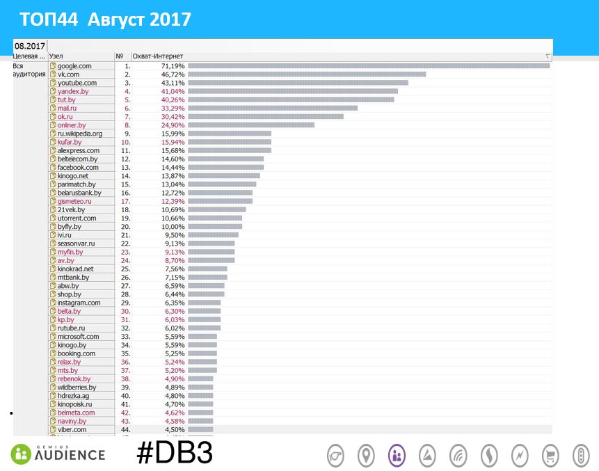 Согласно данным индустриального исследования gemiusAudience, проводимого по инициативе исследовательской компании #DB3, за август 2017 44 сайта по охвату (Reach) беларусскай интернет-аудитории 15-74 года: