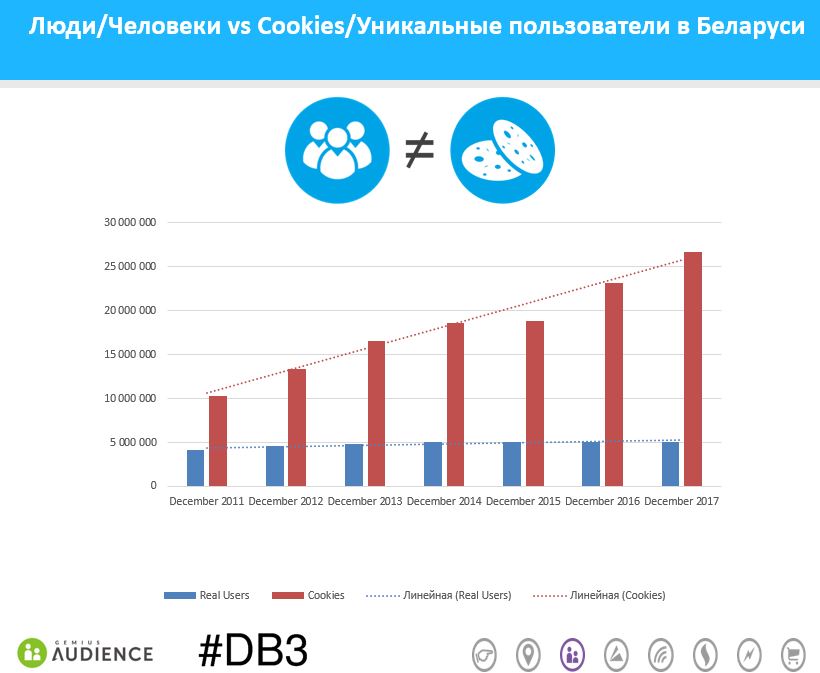 26,6 миллионов беларусских уникальных пользователей (cookies), собрано в декабре 2017 года в рамках аудиторного исследования, проводимого по инициативе #DB3