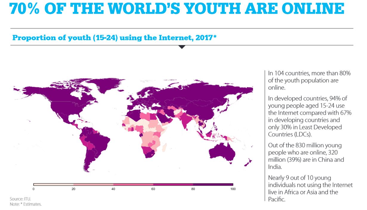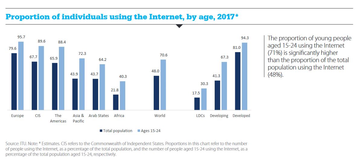В разных частях мира разное число молодежи (15-24) онлайн: