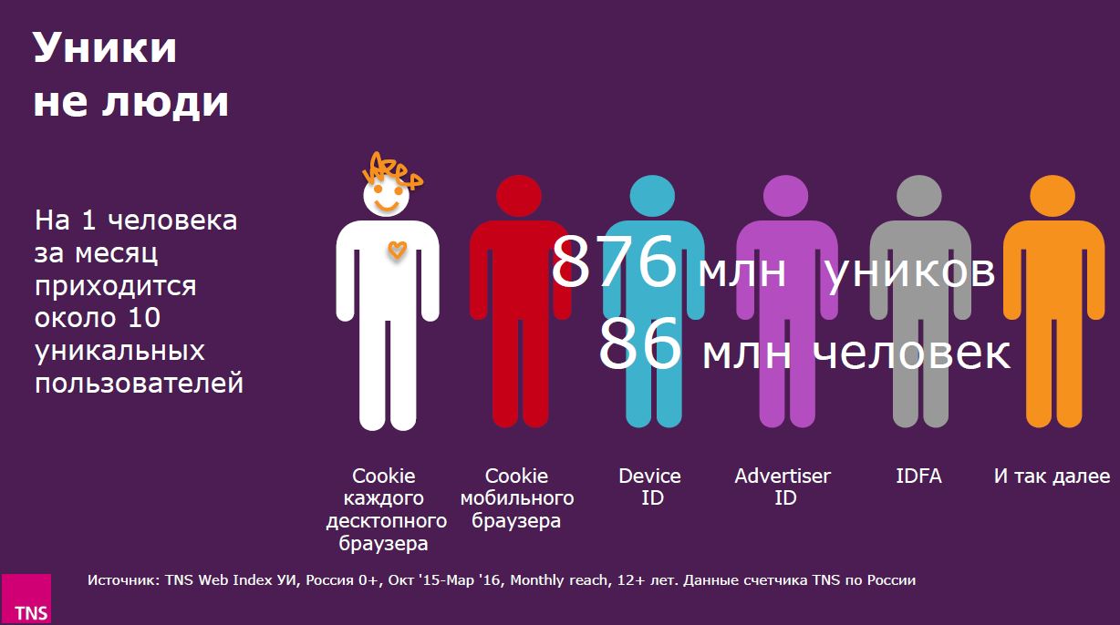 Очередной, свежий слайд от TNS Russia про то, что уникальные пользователи и число людей – это две разных цифры: