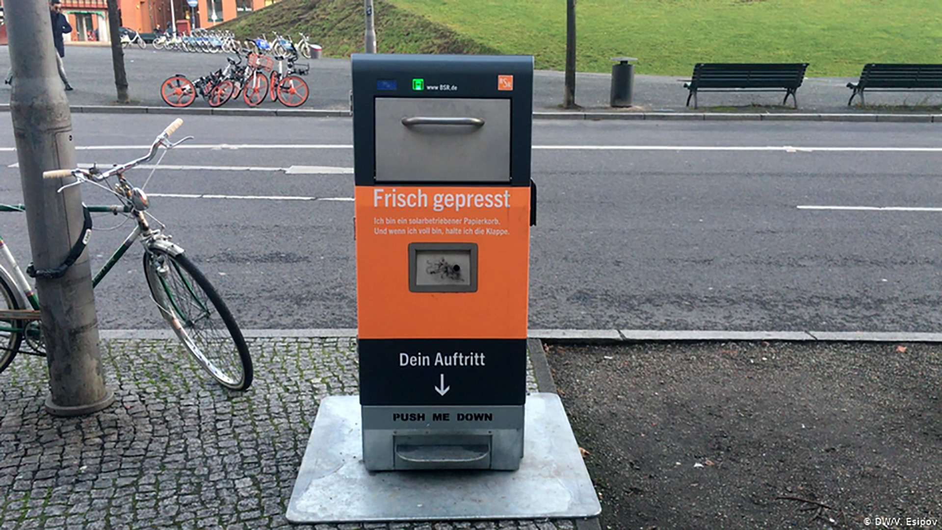 В самом центре Берлина установлено полтора десятка таких машин. Внутри оранжевого контейнера стоит стандартное мусорное ведро вместительностью 120 литров. Но благодаря прессу объём поступающего мусора уменьшается в пять раз, поэтому в него вмещается до 600 литров отходов.