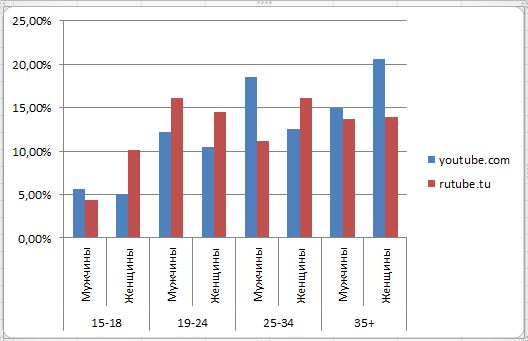 Следующий интересный шаг – это аудитория по полу и возрасту. Здесь оказываются удивительные особенности: большой процент молодых барышень, доля аудитории rutube.ru и больший процент женщин старше 35+ у youtube.com