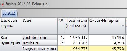 Я взял из мартовских данных исследования gemiusAudience два популярных в Беларуси сервиса: Youtube.com и Rutube.ru.