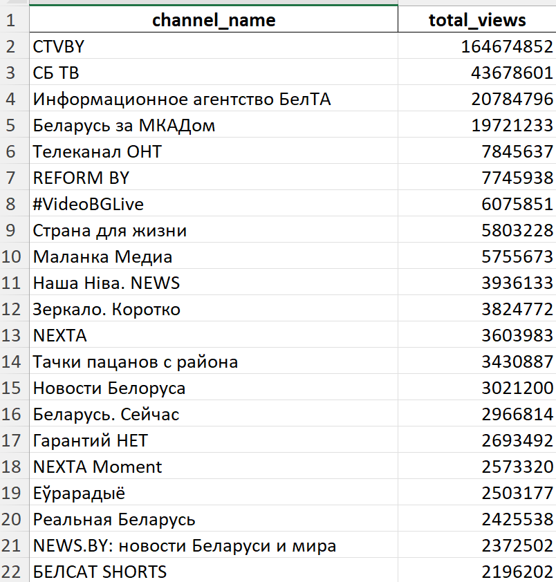 Были проанализированы и добавлены каналы с контентом опубликованные не более, чем год назад, с более 20% подписчиков из Беларуси и не менее 1 000 подписчиков.