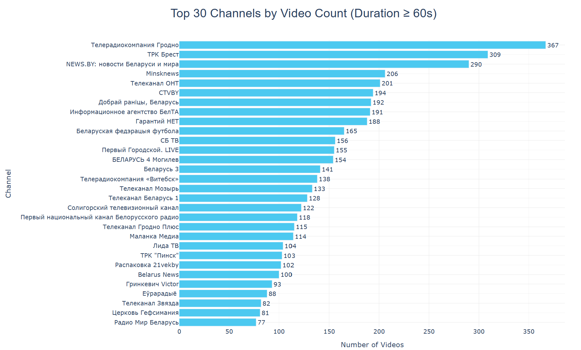 Топ-30 каналов по числу постов, размещенных в июне 2025 и длительностью более 60 секунд: