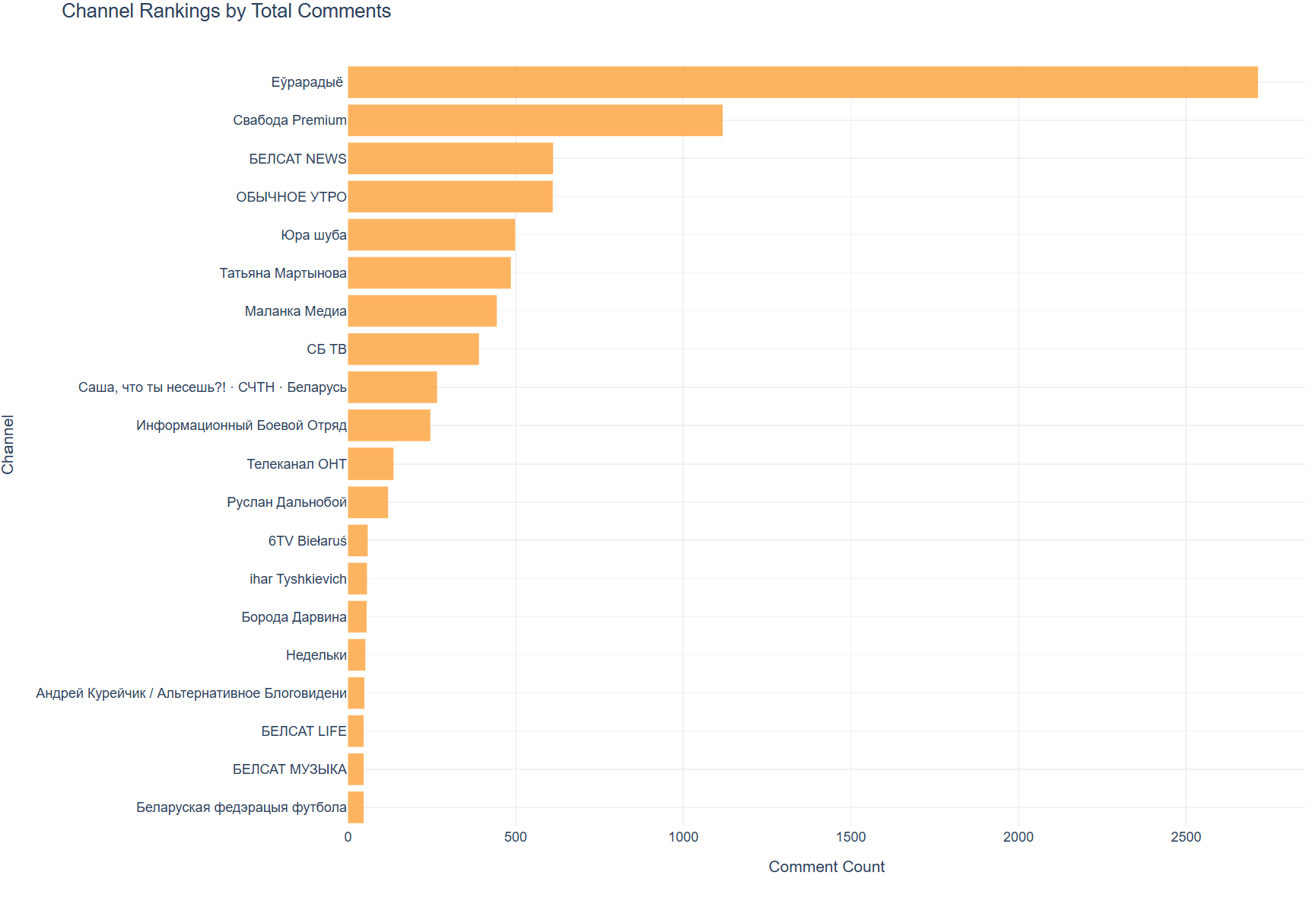 По количеству комментариев Еўрарадыё вновь лидирует с более чем 2500 комментариями, что подтверждает способность новостного и аналитического контента генерировать дискуссии. “Свабода Premium” на втором месте с примерно 1200 комментариями показывает активное сообщество вокруг этого проекта. Высокая комментаторская активность в топе списка указывает на то, что беларуская аудитория YouTube не просто потребляет контент пассивно, но активно участвует в обсуждениях, особенно политических и общественных тем.
