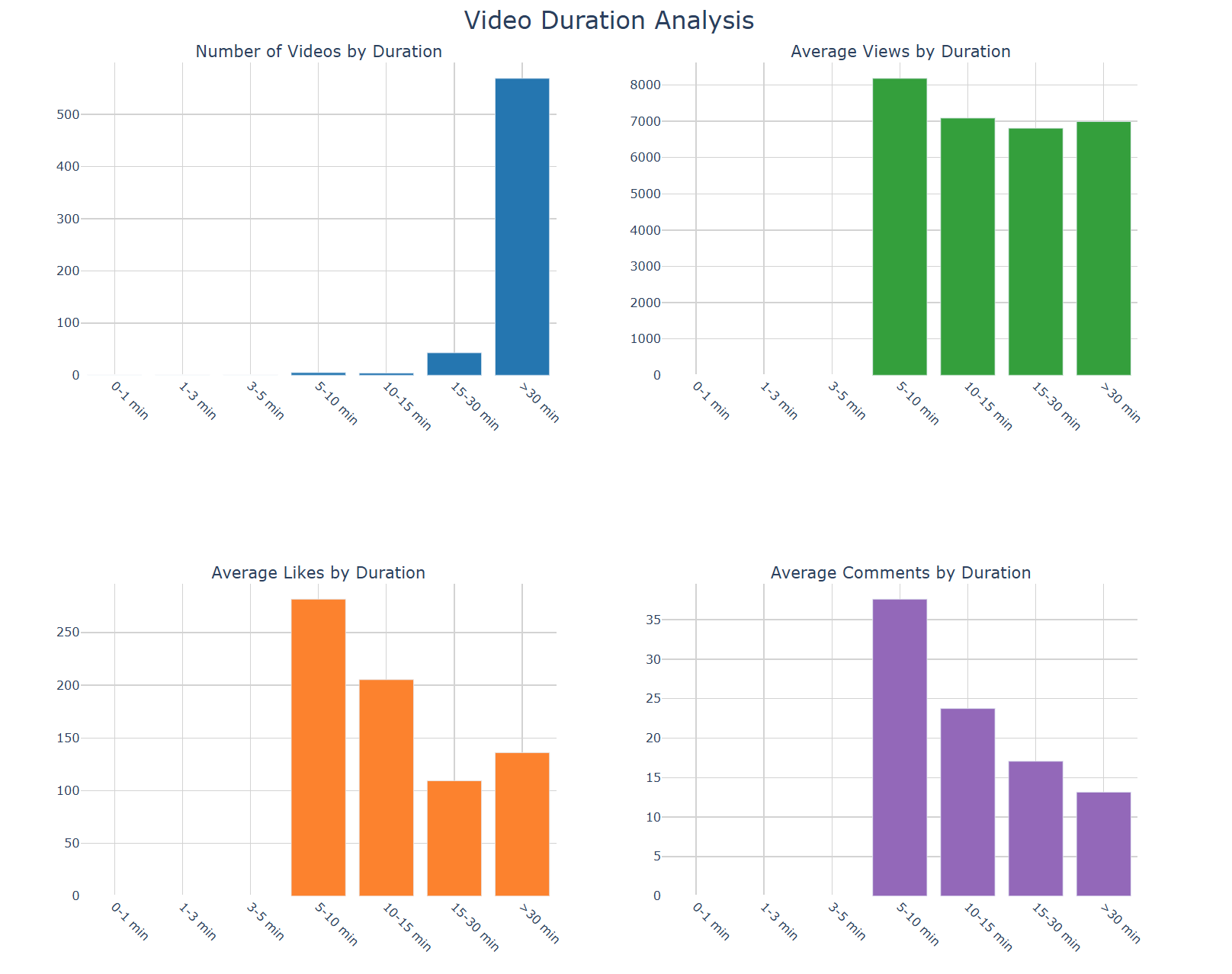 Четыре графика анализа по продолжительности раскрывают интересные закономерности потребления контента. Большинство стримов длится от 30 минут до 6 часов, при этом основная масса контента приходится на диапазон 3-6 часов, что характерно для серьезных аналитических программ и новостных стримов. Однако данные по средним показателям взаимодействия показывают парадокс: короткие видео (1-10 минут) генерируют значительно больше лайков и комментариев в пересчете на единицу времени. Средние просмотры остаются относительно стабильными для форматов от 1 до 6 часов, что указывает на привычку аудитории к длинным форматам, но более высокую активность при просмотре коротких роликов.