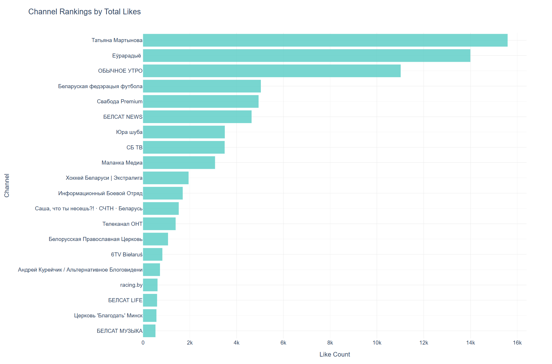 График лайков представляет неожиданную картину, где “Татьяна Мартынова” опережает Еўрарадыё по абсолютному количеству положительных реакций. Это может указывать на более высокую эмоциональную вовлеченность аудитории персонального блога по сравнению с новостным контентом. Еўрарадыё и “ОБЫЧНОЕ УТРО” также демонстрируют высокие показатели, что говорит о лояльности их постоянной аудитории. Соотношение лайков к просмотрам у разных каналов варьируется значительно, отражая различные типы контента и степень эмоциональной связи с аудиторией.