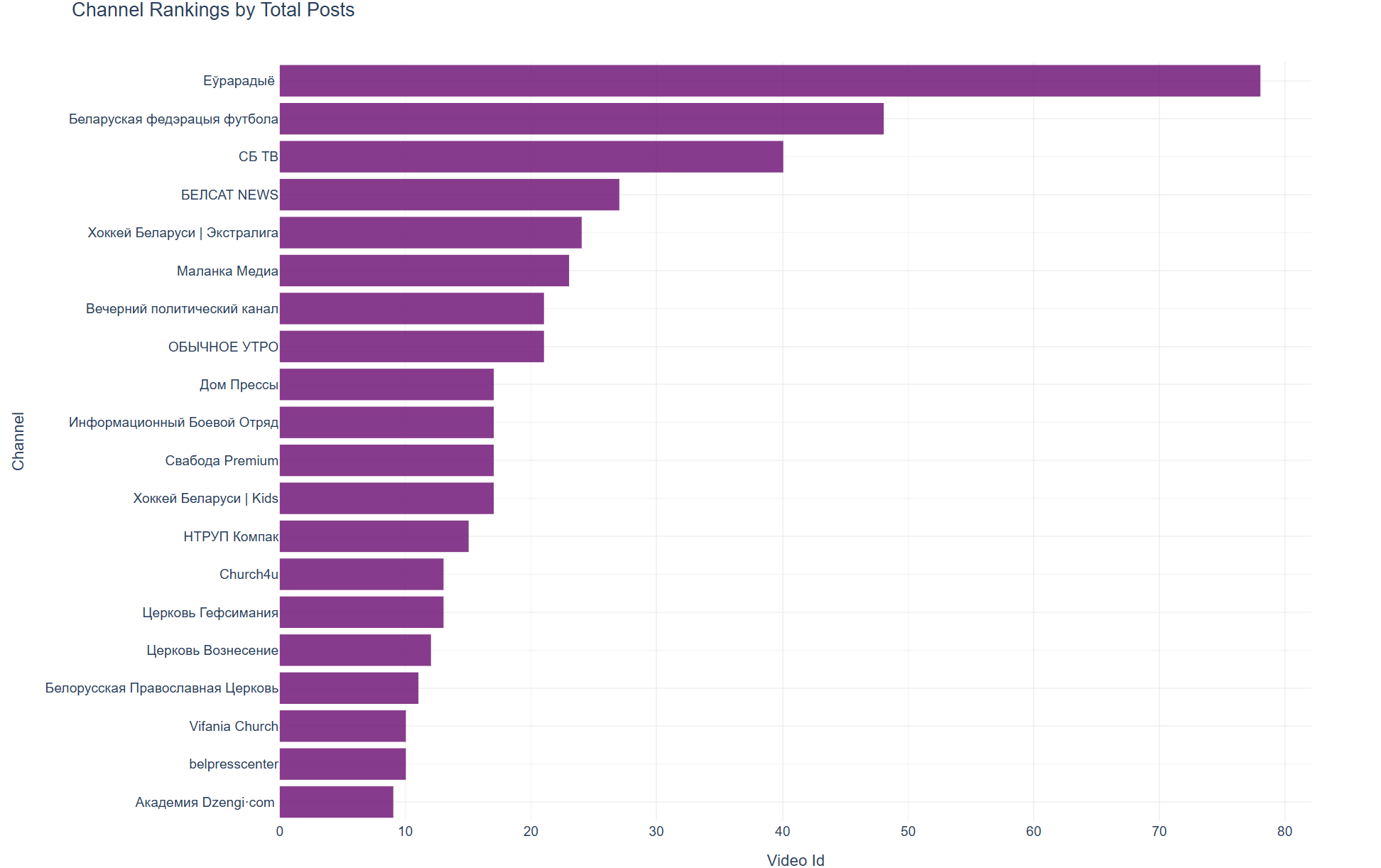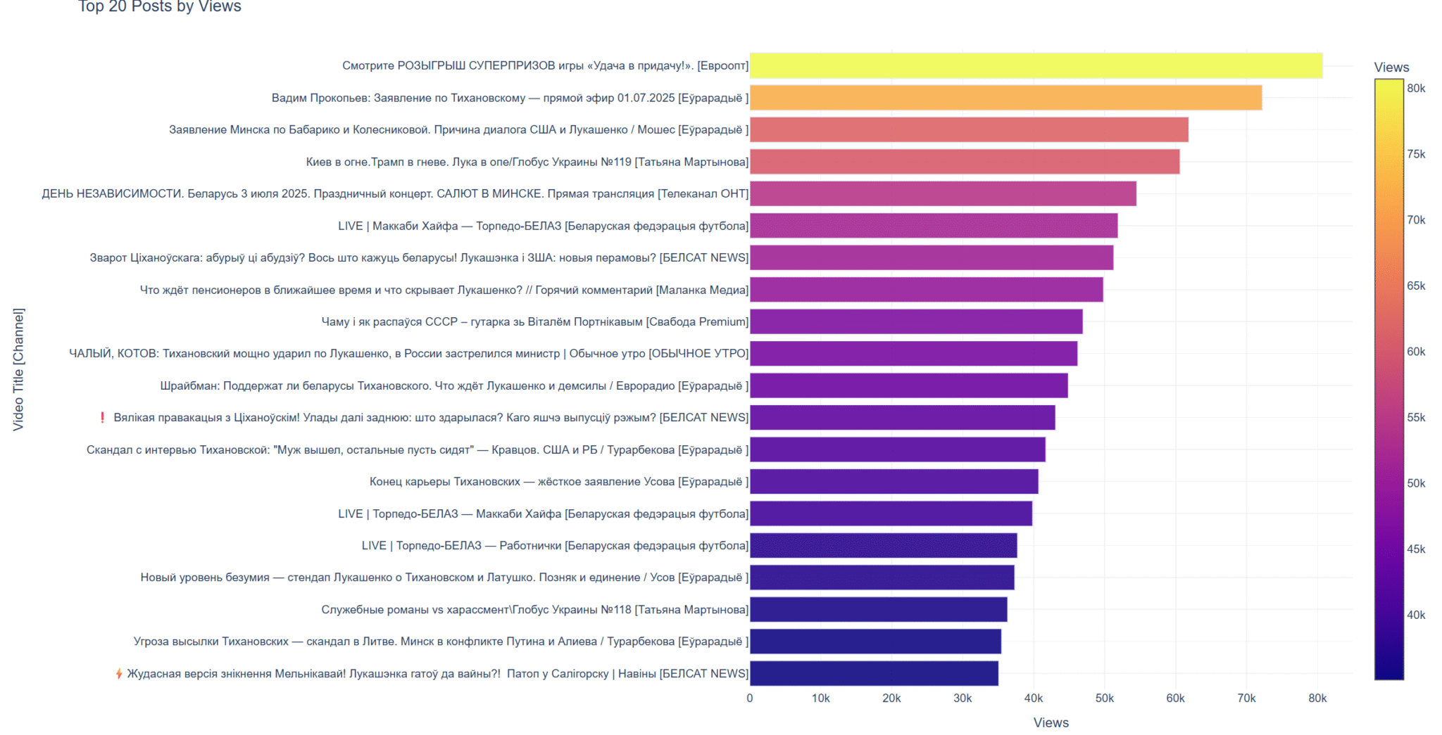 График количества постов показывает, что Еўрарадыё также является самым продуктивным каналом с примерно 80 публикациями за месяц, что соответствует интенсивному режиму работы профессионального медиа. “Беларуская федэрацыя футбола” и “СБ ТВ” также демонстрируют высокую регулярность публикаций, что важно для поддержания аудитории. Распределение показывает здоровое разнообразие подходов к контент-стратегии среди беларуских YouTube-каналов.