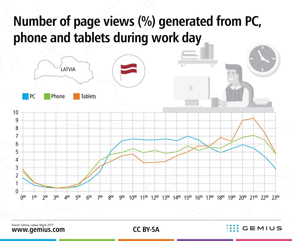 Главная » InternetCEE График дня: количество просмотров страниц в течение рабочего дня в Латвии Автор infopolicy На чтение 1 мин Просмотров 533 Опубликовано 20.06.2017 Данные трафика разделены между платформами: компьютеры, планшеты, мобильные устройства: На основании данных веб-аналитики gemiusPrism и аудиторного медиаисследования gemiusAudience. Похожее