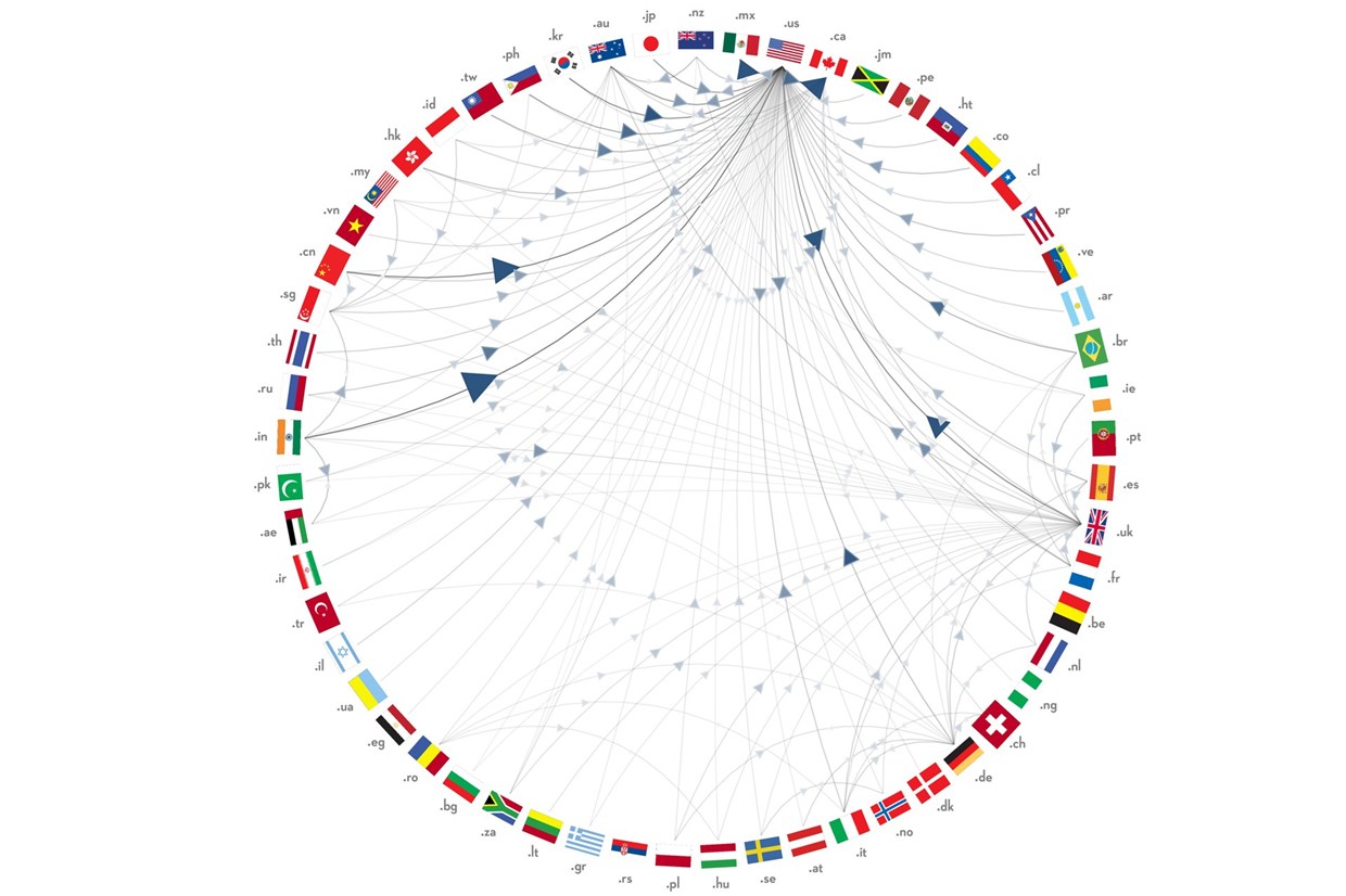 Визуализация миграции между странами на основании 1,26 миллиона профилей в Facebook. Разница между указанным родным городом и физическим местом пребывания:
