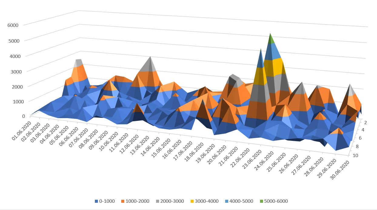 Для построения данного графика был использован API к сервису BuzzSumo. Были собраны по 10 релевантных новостей для Беларуси за каждый день месяца. Каждая новость имела соответствующую оценку Trending Score. Эта оценка, разработанная компанией BuzzSumo, которая измеряет скорость социальных действий в течение 24-часового периода. Оценки не имеют предела — чем больше действий статья получает в короткий промежуток времени, тем выше у нее оценка. Это дает возможность оценить скорость распространения информации не только с крупнейших информационных ресурсов, но и любого вебсайта, не завися от размера аудитории.