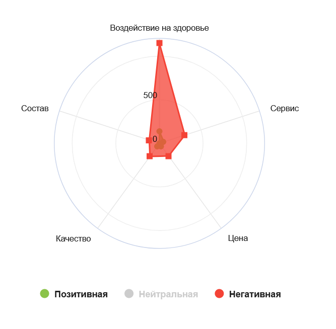 Построим еще один график тональность по аспектам, как видно «воздействие на здоровье» крайне негативная: