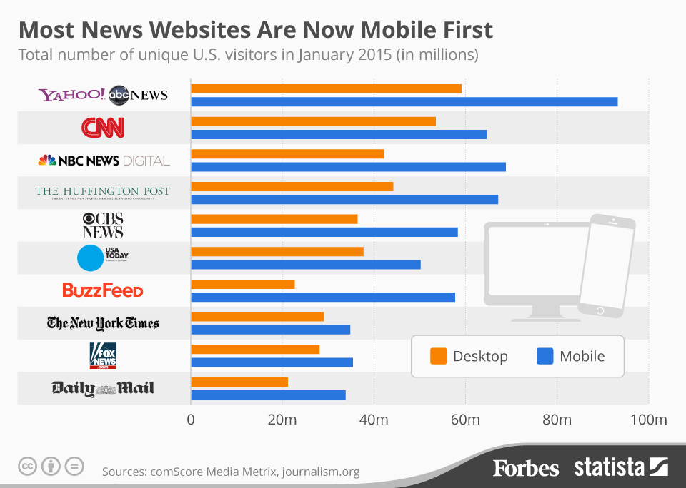 Главная » Mobile График года: большинство американских новостных сайтов — мобильные по аудитории Автор infopolicy На чтение 1 мин Просмотров 449 Опубликовано 03.05.2015 Pew Research опубликовало результаты исследования “State Of the News Media 2015″, используя данные comScore MediaMetrix: Источник: http://www.forbes.com/sites/niallmccarthy/2015/04/30/report-most-news-websites-are-now-mobile-first-infographic/ Похожее