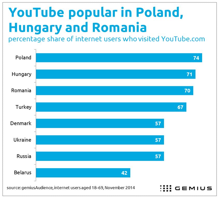 Анализ включает страны, где Gemius проводит гибридное исследование интернет-аудитории — fusion. Данные — ноябрь 2014. Возраст интернет-зрителей — 18-69 лет.